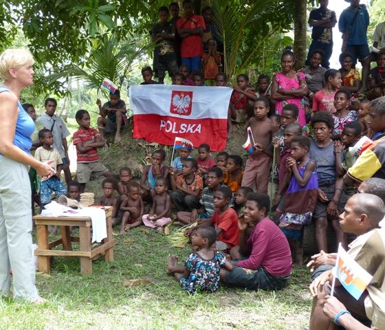 Właśnie tam, w jednej z nich - w Palimbe, spotkałam się z dziećmi i młodzieżą… pod liśćmi bananowca. Tłumaczem na język pingin był misjonarz, werbista. Rozmawialiśmy o Polsce. Wiedzieli, że leży gdzieś tam …w Europie, że Jan Paweł II był Polakiem… Rozmawialiśmy o miastach - stolicach: Porcie Moresby i Warszawie; o największych rzekach: Wiśle i Sepiku Pokazałam im polską flagę. Moi rozmówcy dopatrzyli się wielu podobieństw. Spostrzegli, że czerwień jest naszym wspólnym kolorem, a także ich rajski ptak to symbol na miarę naszego orła. Nie ukrywam, że zainteresowanie młodych ludzi wzbudziły albumy, które ze sobą przywiozłam. Fascynowały ich krajobrazy zimowe, umeblowania mieszkań, olbrzymie ilości samochodów, moda. Opowiadałam im o mieście, w którym mieszkam, Bydgoszczy. Salwy śmiechu wywoływały próby poprawnego wypowiadania nazwy. Po kilku próbach słowo BYDGODZCZ zabrzmiało prawie bezbłędnie. Rozmawialiśmy również o książkach i czytaniu. Wiem już, że dzieci z Palimbe tak naprawdę nie obcują ze słowem pisanym. A szkoda… bo mogłyby być wielkimi sympatykami książek, jednak nie mają do nich dostępu, gdyż są one bardzo drogie, rodziców nie stać na ich zakup. W szkole zaś są tylko zeszyty i podręczniki, te same rok po roku i to nie dla wszystkich.