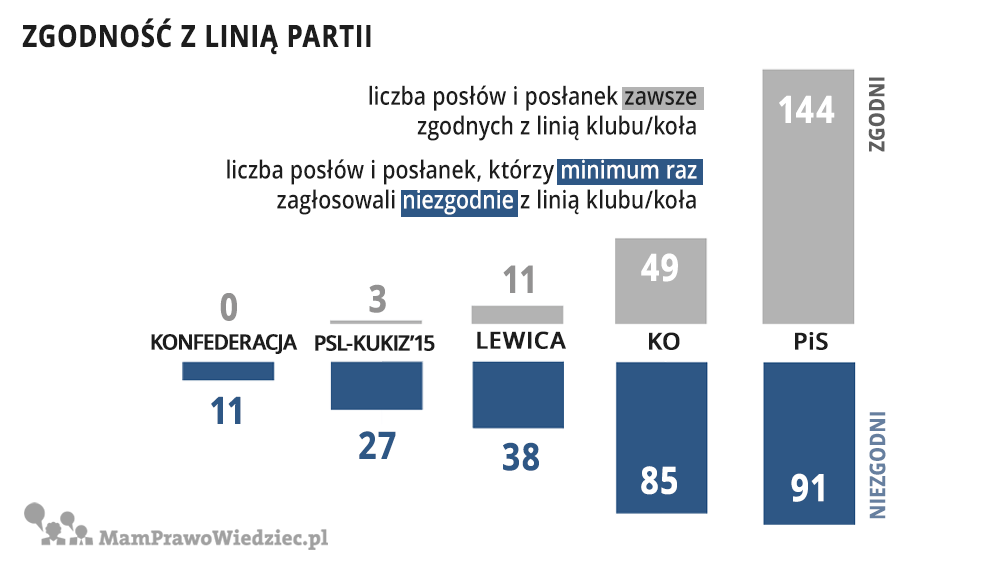 Te cztery punkty proc. niezgody sprawiają, że Konfederaci są wyjątkiem wśród ugrupowań w Sejmie. Przedstawiciele ugrupowania różnili się podczas 59 na 127 głosowań, m.in. w głosowaniu nad zmianą ustawy o emeryturach i rentach, czy nad zmianą ustawy o świadczeniach opieki zdrowotnej finansowanych ze środków publicznych.