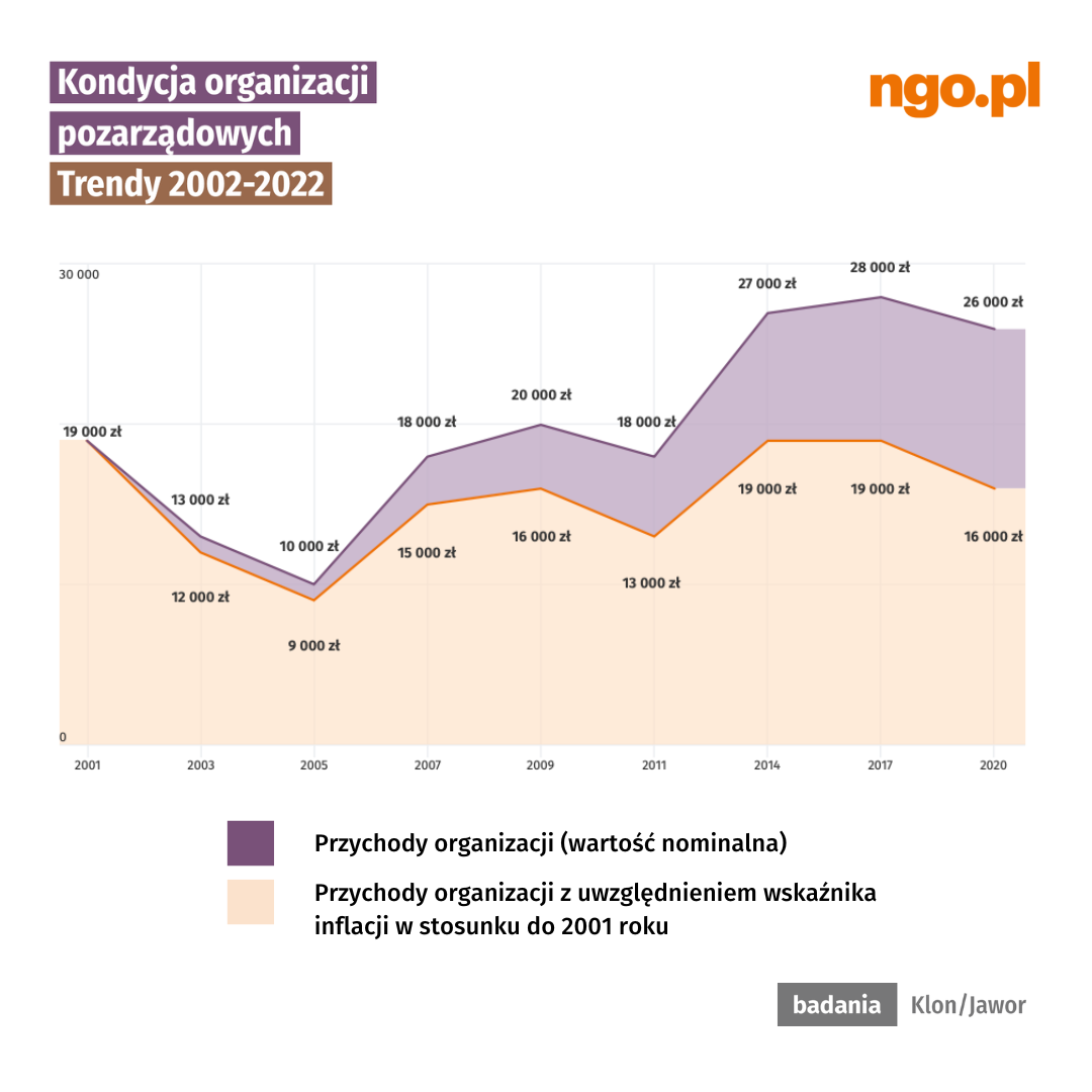 Poziom realnych przychodów organizacji nie rośnie od 2001 roku, a co najwyżej utrzymuje się na podobnym poziomie lub wręcz spada (między rokiem 2003 a 2011, a następnie w 2020).