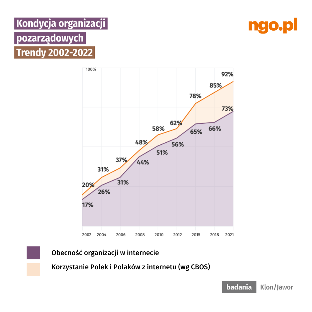 Na koniec informacja pozytywna: dynamicznie rośnie wykorzystanie przez organizacje internetu do komunikacji z otoczeniem. Między 2002 a 2021 rokiem procent organizacji, o których można znaleźć informację w internecie wzrósł 4,5 krotnie – z 20% do ponad 90%. Rosnący trend obecności organizacji w internecie (oznaczający, że organizacja posiada stronę internetową lub inny rodzaj swojej wizytówki w sieci) przebiega równolegle z coraz powszechniejszym dostępem oraz korzystaniem z internetu całego społeczeństwa, a także z rozwojem i częstszym używaniem różnego rodzaju aplikacji internetowych.