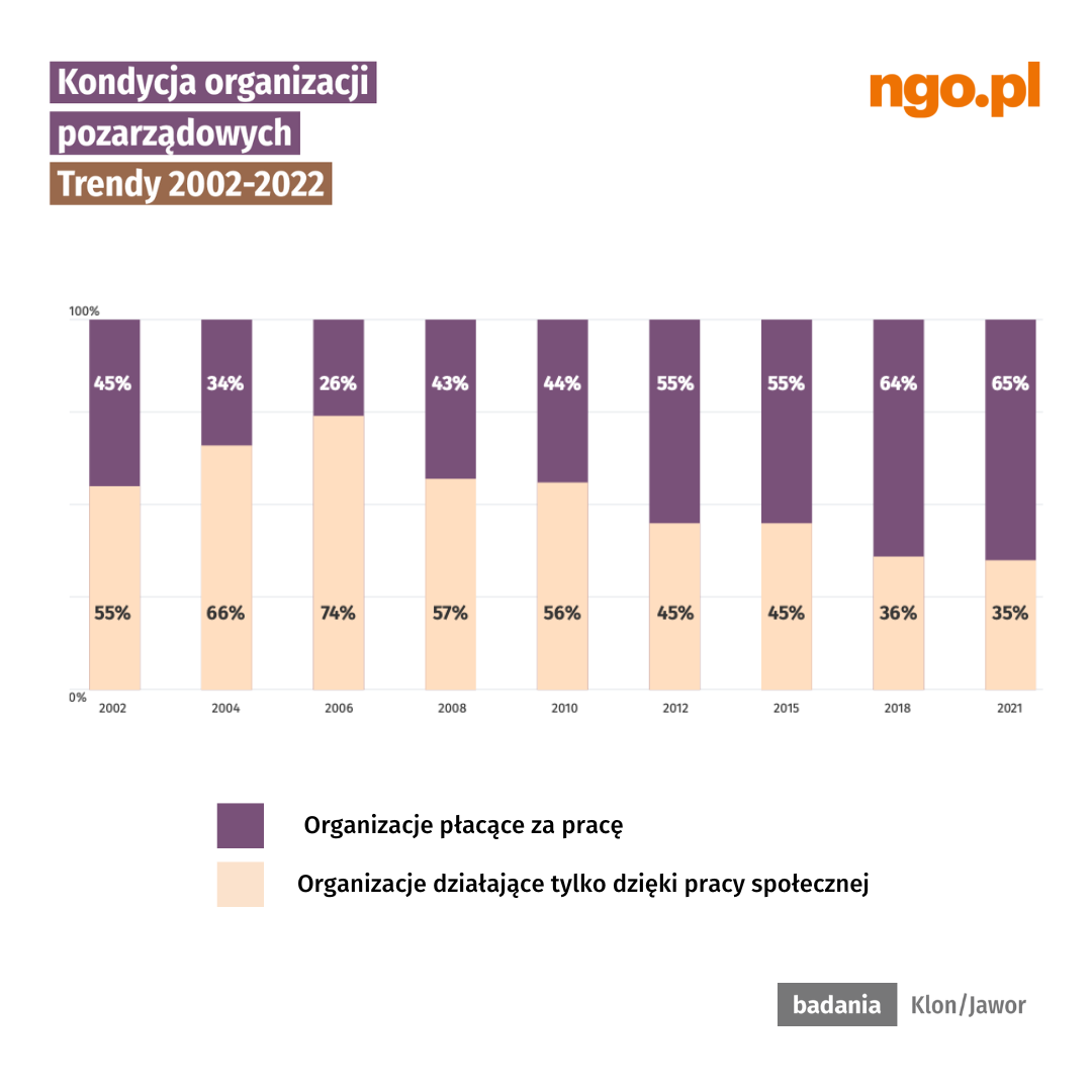 Organizacje pozarządowe są kojarzone ze społecznym, bezpłatnym zaangażowaniem działaczek i działaczy. Jednakże, poza pracą społeczną, korzystają też z pracy odpłatnej. Przyglądając się długiej, 20-letniej perspektywie czasowej, obserwujemy zmianę w charakterze, w jakim organizacje angażują osoby do pracy i do działania na rzecz stowarzyszeń czy fundacji. Z biegiem czasu powiększa się grupa organizacji, które płacą za pracę, zmniejsza się natomiast odsetek organizacji, które działają wyłącznie dzięki pracy bezpłatnej, społecznej.