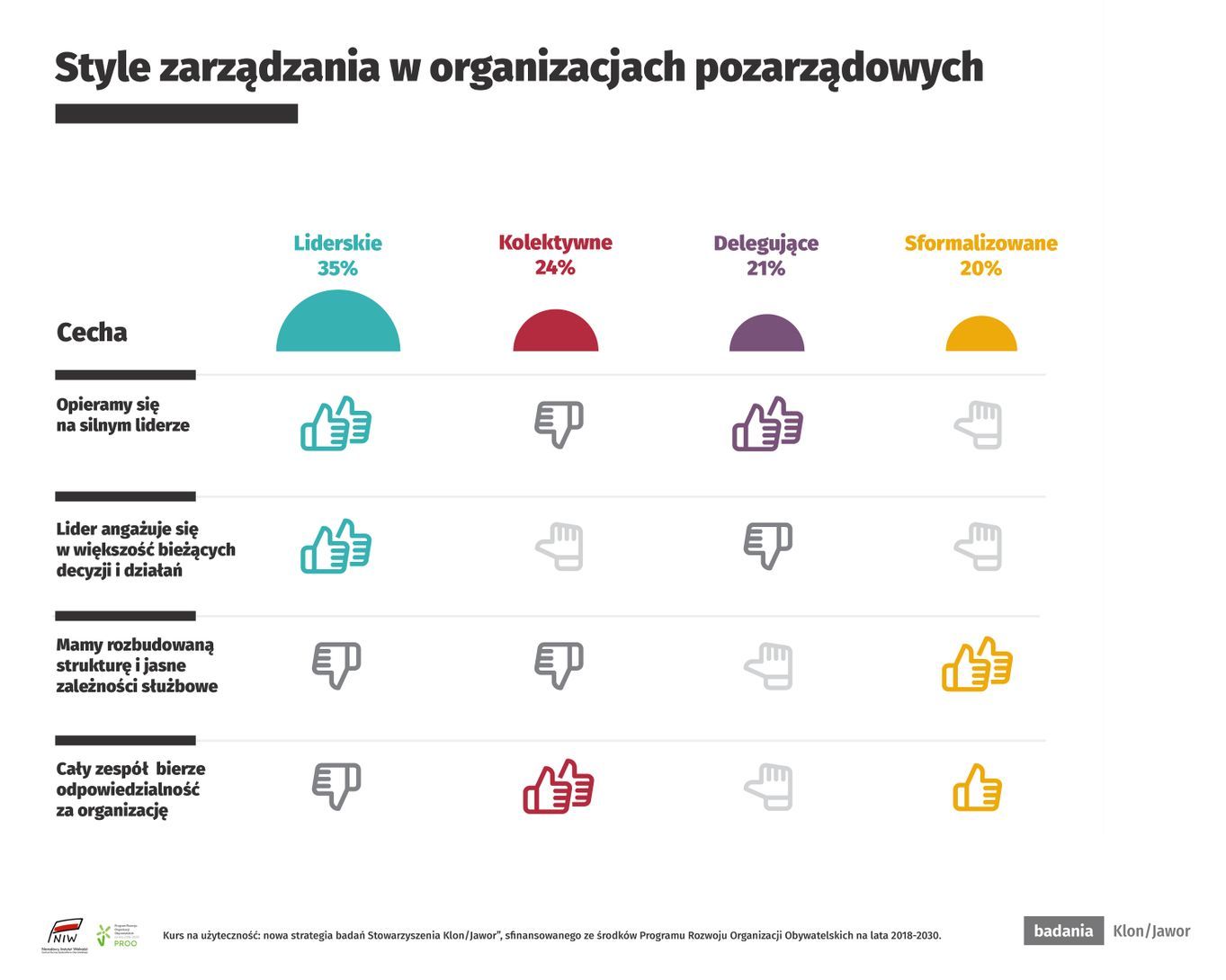 Jak wyglądają proporcje między wyróżnionymi modelami zarządzania? Na pierwszy rzut oka można powiedzieć, że dzielą one sektor na cztery ćwiartki… Nie jest to jednak do końca prawda. Najliczniej reprezentowany jest model liderski – silny lider będący „sterem, żeglarzem i okrętem” charakteryzuje sposób funkcjonowania 35% organizacji.