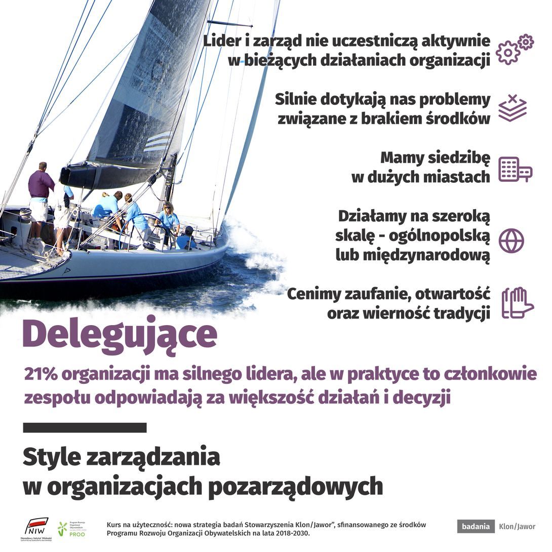 Drugi model, w którym lider również odgrywa dużą rolę, to ten charakterystyczny dla organizacji delegujących. W taki sposób działa 21% stowarzyszeń i fundacji. Można więc powiedzieć, że w nieco ponad połowie organizacji (w sumie 56%) odpowiedzialność i najważniejsze decyzje koncentrują się w jednym ręku (choć w modelu delegującym zespół ma sporo do powiedzenia w kwestiach codziennych działań).