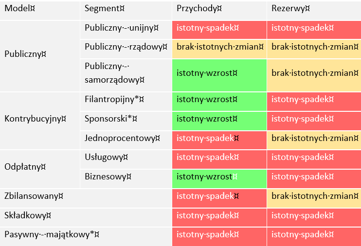 - Największa wrażliwość: organizacje żyjące z majątku oraz sprzedaży usług zanotowały drastyczne spadki rezerw i przychodów.