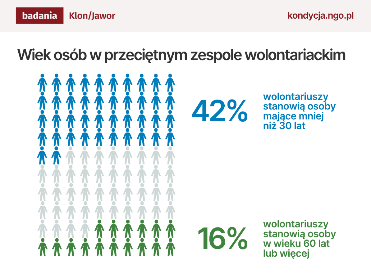 Na podstawie danych z naszego badania „Kondycja organizacji pozarządowych 2024” możemy określić, że wolontariat to często domena młodych osób. Wolontariusze i wolontariuszki poniżej 30. roku życia w przeciętnym zespole stanowią niemalże jego połowę (42%). Z kolei osoby w wieku senioralnym – powyżej 60 lat – są znacznie rzadziej spotykane w zespołach wolontariackich. Mniej niż co piąta osoba działająca w grupie wolontariuszy przy organizacji jest w tej grupie wiekowej (16%).