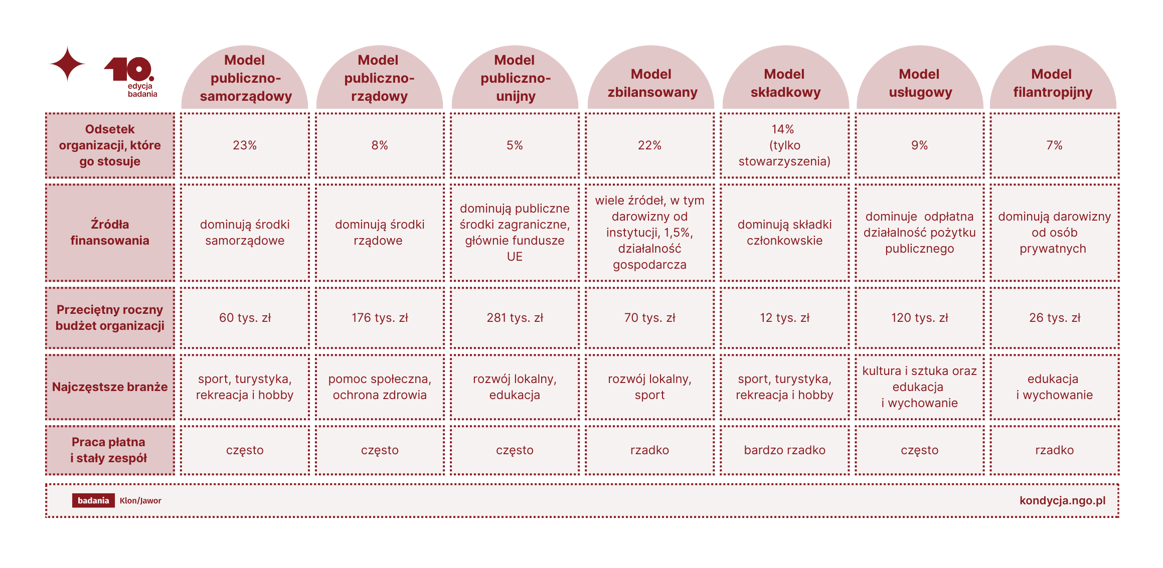 Organizacje pozarządowe mają do dyspozycji wiele źródeł finansowania, które w badaniu „Kondycja…” grupujemy na 17 typów. Aby łatwiej się w tym odnaleźć, w badaniu wyodrębniłyśmy siedem głównych sposobów, czyli modeli finansowania. Każdy z tak rozumianych modeli jest definiowany przez konkretną strukturę źródeł przychodów – czyli wachlarz źródeł, które organizacja spośród badanych 17 wybiera, oraz przeważające źródło przychodów.