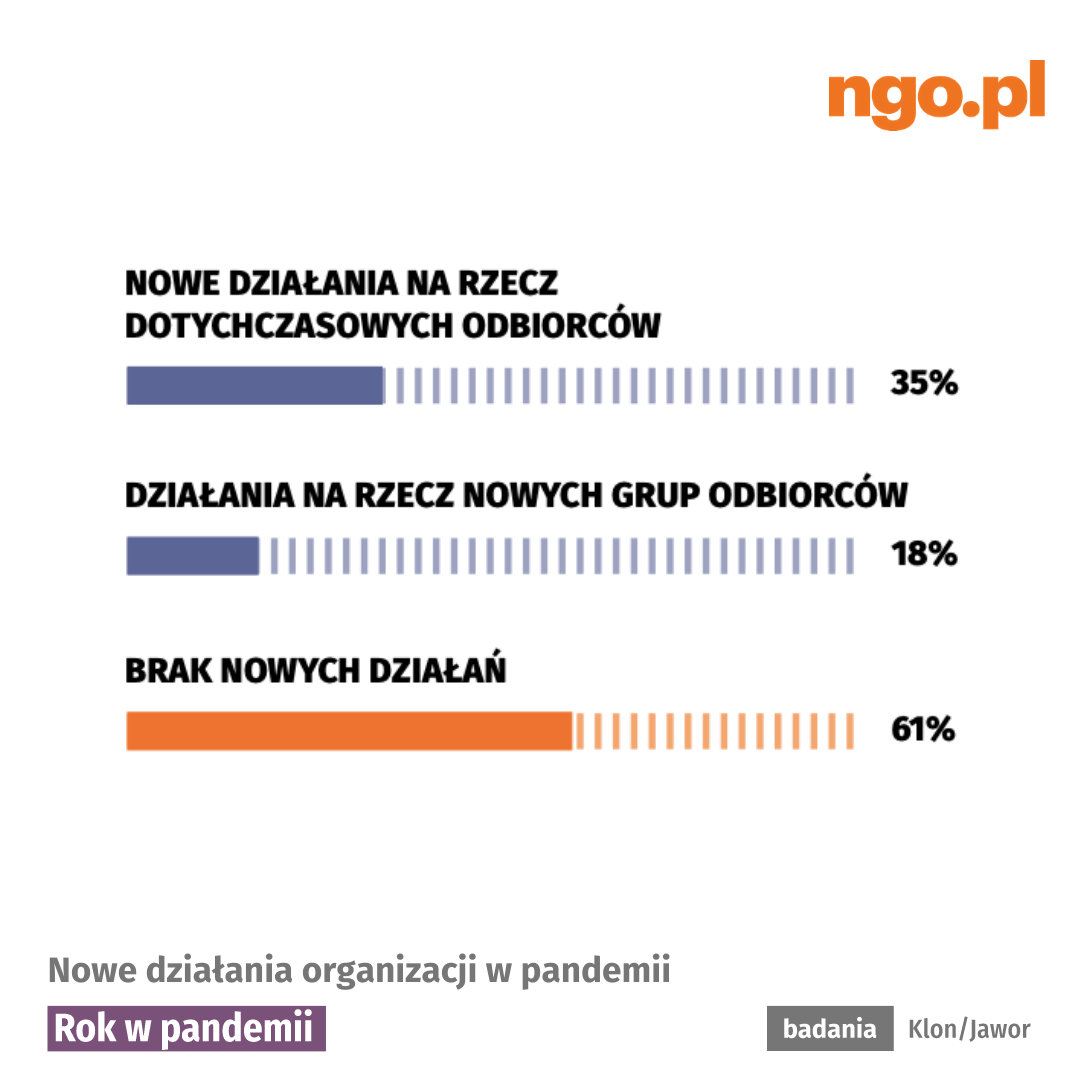 Pierwsze badanie wpływu pandemii na sektor pozarządowy przeprowadziłyśmy już w kwietniu 2020 roku. Wtedy widać było przede wszystkim szok związany z koniecznością zawieszenia wielu dotychczasowych działań lub znalezienia dla nich nowej formuły, chaos informacyjny, brak jasnych wytycznych, niepewność, ale też dużą mobilizację sektora społecznego.