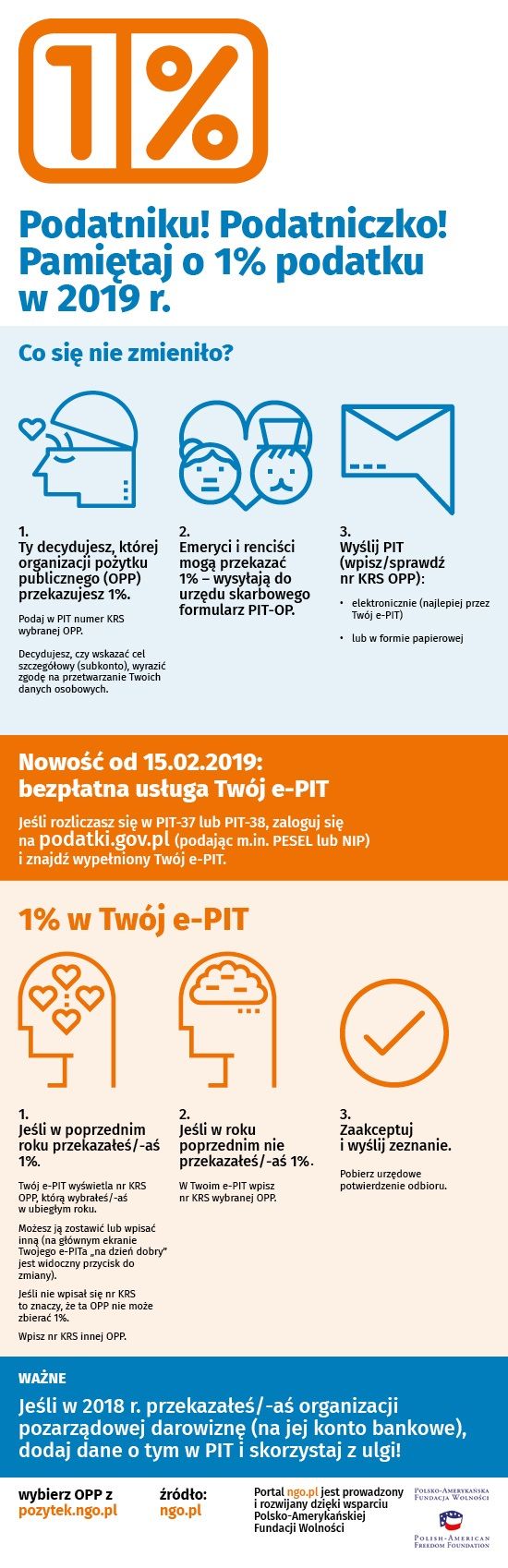 15 lutego 2019 r. rusza nowa usługa Twój e-PIT . Jeśli rozliczasz się w PIT-37 lub PIT-38, zaloguj się na stronie podatki.gov.pl (podając m.in. PESEL lub NIP) i znajdź wstępnie wypełnione swoje zeznanie podatkowe. Pojawią się w nim m.in. dane organizacji pożytku publicznego, której przekazałeś/przekazałaś 1% za 2017 rok. Możesz te dane pozostawić bez zmian (sprawdź tylko, czy organizacja ta nadal ma prawo otrzymywać 1% za 2018 r.) lub wpisać dane innej uprawnionej organizacji.