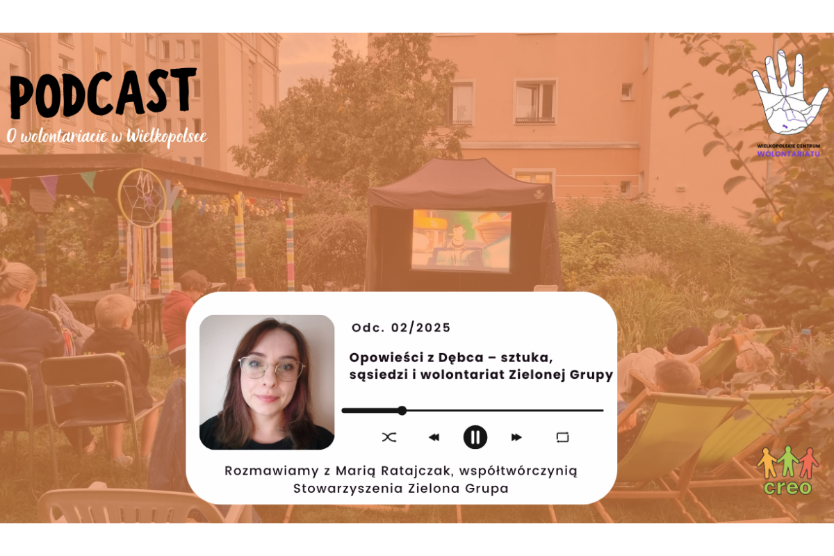 Prezentujemy drugi odcinek naszego podcastu o wolontariacie w Wielkopolsce! Tym razem rozmowa przenosi nas na poznański Dębiec – osiedle, gdzie sąsiedzkość i lokalne więzi naprawdę mają znaczenie. To właśnie tu działa Stowarzyszenie Zielona Grupa, które od lat rozwija inicjatywy artystyczne, społeczne i edukacyjne, tworząc przestrzeń do spotkań, twórczości i wymiany doświadczeń.