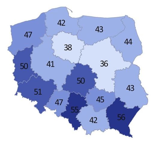 Najwięcej organizacji działających w 100% społecznie, czyli dzięki bezpłatnemu zaangażowaniu liderów, członków i wolontariuszy, jest w województwie podkarpackim (56%). Tym samym oznacza to, że najmniej organizacji w tym regionie zatrudnia pracowników (stałych bądź nie).