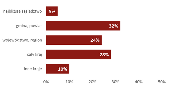 37% organizacji nie wykracza w swoich działaniach poza poziom lokalny – działa na terenie najbliższego sąsiedztwa, gminy bądź powiatu. Regionalny zasięg działalności deklaruje 25% organizacji, działania w skali całego kraju zgłasza nieco więcej organizacji – 28%. Na arenie międzynarodowej jest aktywne 10% organizacji. Zasięg działań organizacji nie zmienił się znacząco w porównaniu do lat poprzednich. Warto jednak pamiętać, że większość organizacji prowadzi równolegle działania na różną skalę. Na przykład działając na poziomie województwa, organizacje są aktywne także na szczeblu gminnym. Kiedy spojrzymy na wszystkie szczeble, na jakich działa dana organizacja, zauważymy pewną różnicę w porównaniu do wcześniejszych edycji badań. Mianowicie, nie zmienia się odsetek organizacji, które działają w skali całej Polski oraz na terenie innych krajów, jednak istotnie zwiększa się odsetek organizacji działających na poziomie najbliższego sąsiedztwa (2015 – 43%, 2012 – 33%), gminy lub powiatu (2015 – 63%, 2012 – 55%) oraz województwa (2015 – 43%, 2012 – 36%). Oznacza to, że organizacje działające na skalę ogólnopolską i międzynarodową coraz częściej schodzą ze swoimi działaniami także na poziom regionalny i lokalny, inaczej mówiąc, są aktywne na coraz większej liczbie szczebli.