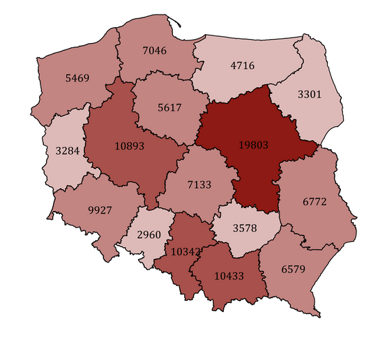Liczba zarejestrowanych stowarzyszeń i fundacji różni się w zależności od regionu Polski – zdecydowanie najwięcej jest ich na Mazowszu, niemal 20 tys., w tym połowa w samej Warszawie. Po około 10 tys. organizacji jest zarejestrowanych w Wielkopolsce, Małopolsce, na Śląsku oraz na Dolnym Śląsku. Zdecydowanie najmniej stowarzyszeń i fundacji działa w województwie opolskim i podlaskim – po około 3 tys.
