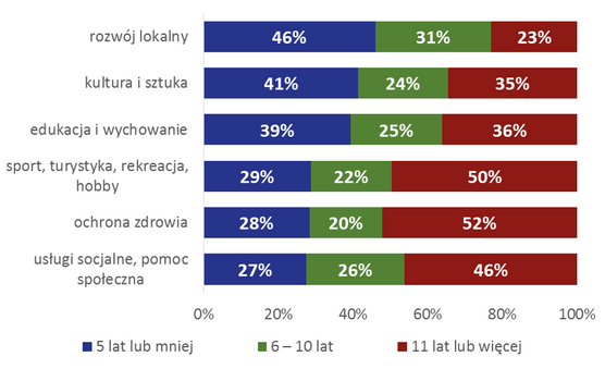 Organizacje działające w różnych obszarach są zróżnicowane pod względem długości swojego istnienia. Do najmłodszych należy branża zajmująca się rozwojem lokalnym – niemal połowa organizacji (46%) specjalizujących się w tej dziedzinie działają nie dłużej niż 5 lat, a staż przeciętnej organizacji reprezentującej tę branżę wynosi 6 lat. Zbliżoną strukturę „wieku” mają organizacje kulturalne oraz edukacyjne, a ich przeciętny okres działalności to 7 lat. Wyraźnie starsze są organizacje funkcjonujące na polach sportu, turystyki, rekreacji i hobby oraz usług socjalnych i pomocy społecznej; przeciętnie organizacje te prowadzą działalność od 10 lat. Najstarszą branżą jest jednak ochrona zdrowia – ponad połowa organizacji (52%) działających w tym obszarze jest aktywna od 11 lub więcej lat. Tyle też wynosi „wiek” przeciętnej organizacji aktywnej na tym polu – jest to niemal dwukrotnie więcej niż „wiek” przeciętnej organizacji działającej w obszarze rozwoju lokalnego.