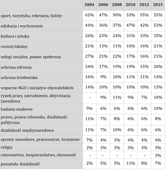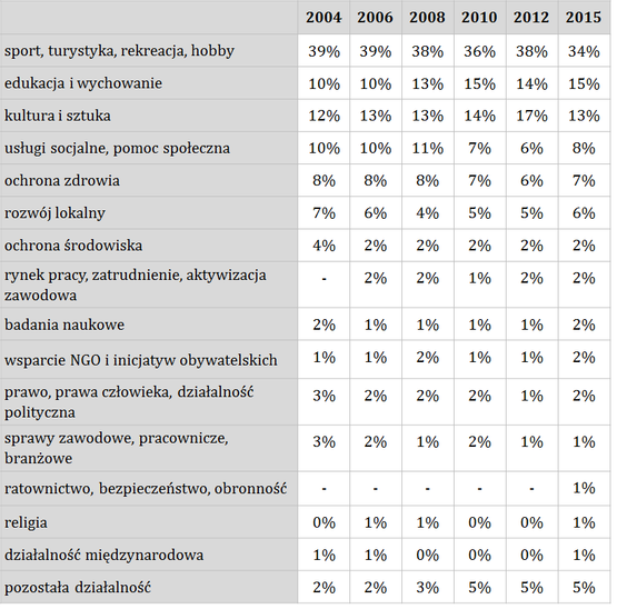 Podobnie jak przez trzema laty tak i teraz największą branżą polskiego sektora pozarządowego jest „sport, rekreacja, turystyka, hobby”, choć odsetek organizacji specjalizujących się w tej dziedzinie jest o 4 pkt. proc. mniejszy niż trzy lata wcześniej. W 2012 roku drugą w rankingu była branża „kultura i sztuka”. Kurcząc się o 4 pkt. proc, a tym samym powodując załamanie kilkuletniego wzrostowego trendu, dziś zajmuje ona już trzecie miejsce, a drugim co do wielkości obszarem działań organizacji jest „edukacja i wychowanie” (wzrost o 1 pkt. proc. w porównaniu do 2012 roku).