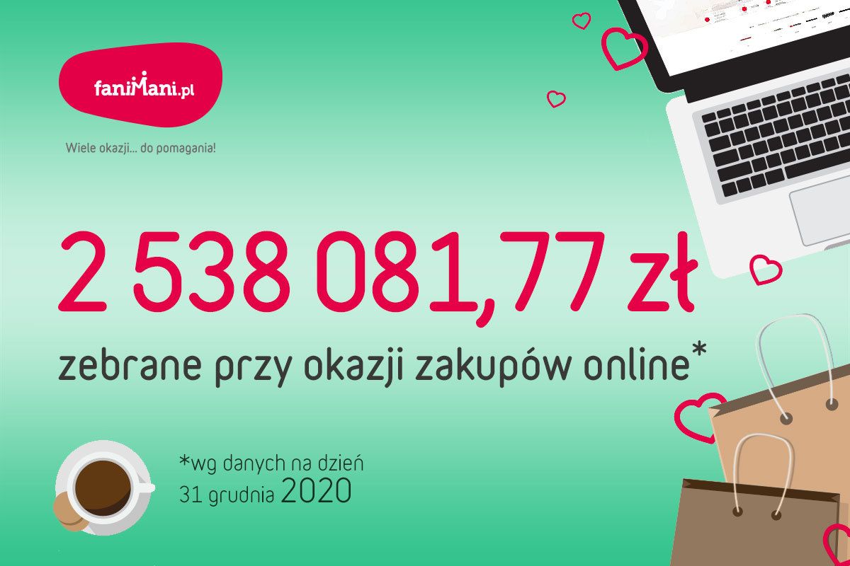 Na koniec 2020 roku w serwisie FaniMani.pl zebranych zostało ponad dwa i pół miliona złotych darowizn przy okazji zakupów online. Użytkownicy FaniMani wydali w ubiegłym roku 62 236 358 zł na dobre zakupy.