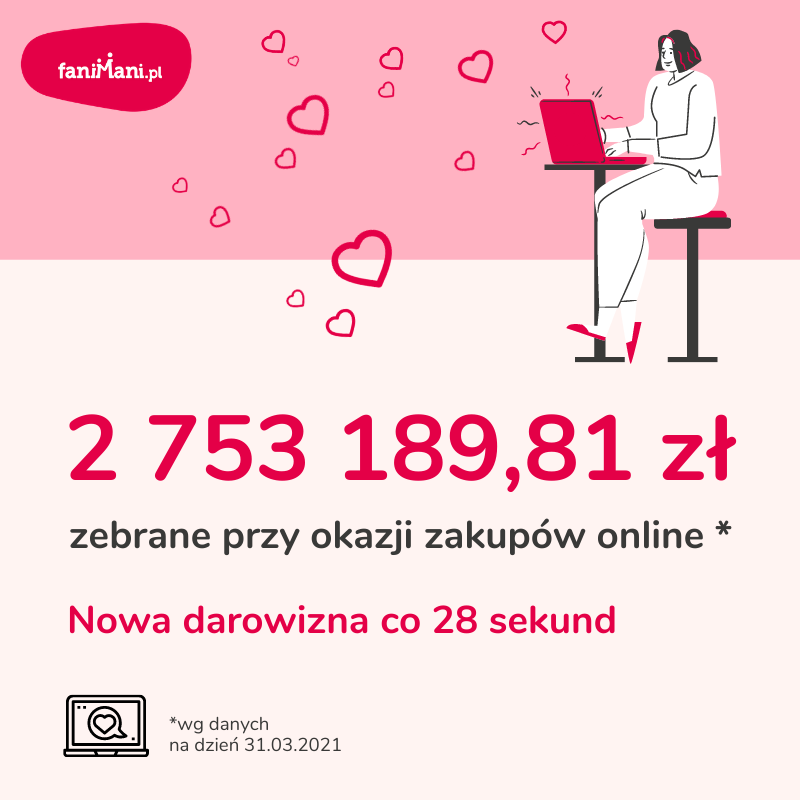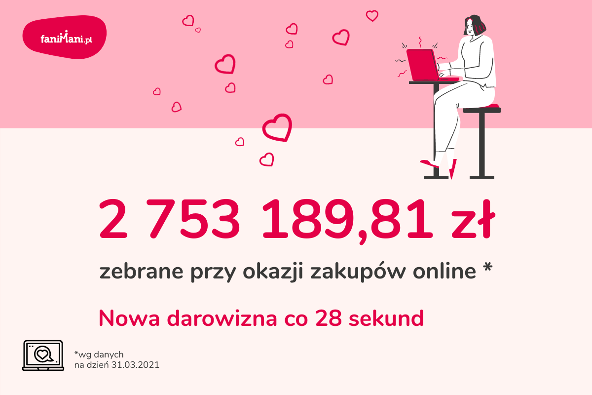 Przygotowaliśmy podsumowanie darowizn zebranych przy okazji zakupów online na FaniMani.pl po pierwszym kwartale 2021 r. Łącznie zebraliśmy w ten sposób ponad 2 753 189,81 zł. W serwisie FaniMani.pl nowa darowizna pojawiała się co 28 sekund.