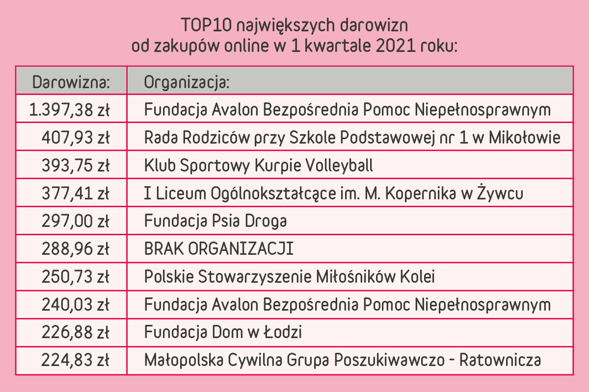 TOP10 największych darowizn od zakupów online w 1. kwartale 2021 roku