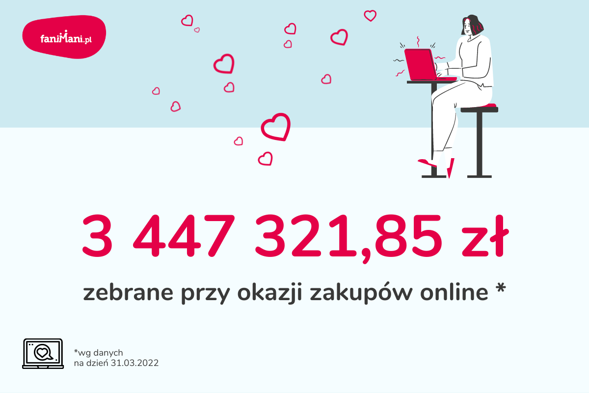 Przygotowaliśmy podsumowanie darowizn zebranych przy okazji zakupów online na FaniMani.pl po pierwszym kwartale 2022 r. Organizacje społeczne zebrały w ten sposób łącznie już 3 447 321,85 zł. Największa jednorazowa darowizna od zakupów online zrobionych razem z FaniMani.pl w ubiegłym kwartale wyniosła aż 685,79 zł.