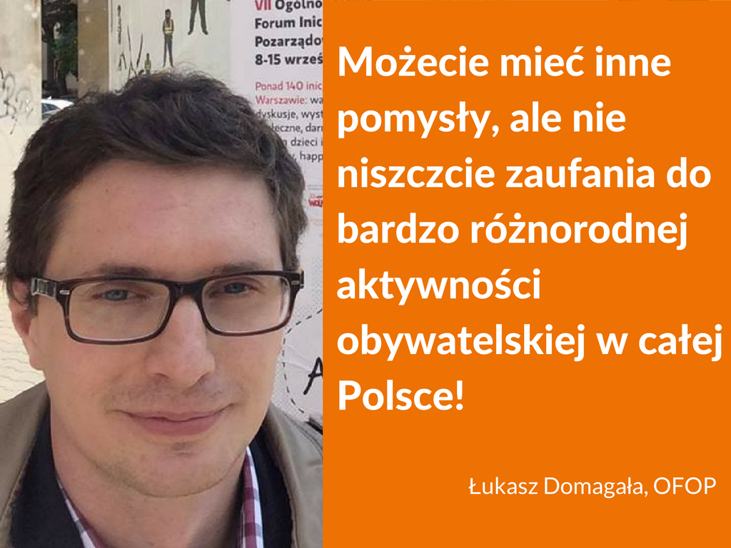 – Widzimy, że władza o aktywności społecznej myśli w ten sam sposób, co o innych sferach życia publicznego. Również nas zaczyna się dzielić na dobrych i złych, na prawdziwych społeczników i tych, mówiąc brutalnie, „gorszego sortu” – mówi Łukasz Domagała z OFOP w podsumowaniu roku 2016.