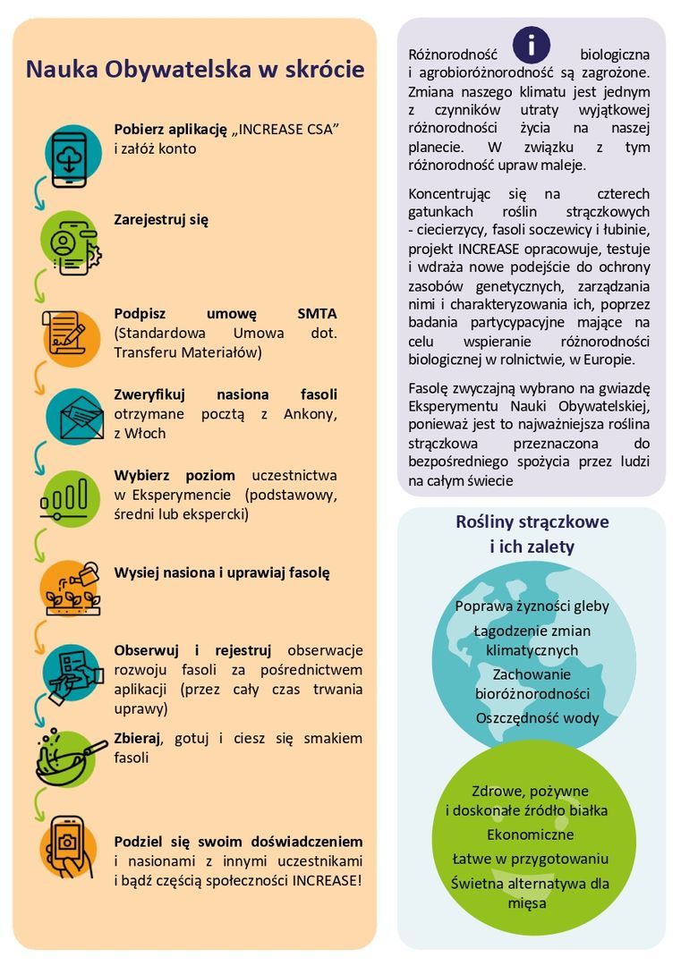 W ramach Eksperymentu Nauki Obywatelskiej każda uczestniczka i uczestnik otrzyma nasiona różnych starych odmian fasoli do uprawy i pielęgnacji, i jednoczesnej dokumentacji ich rozwoju poprzez przesyłanie zdjęć i obserwacji cech fenotypowych (cech rozwoju) w aplikacji INCREASE Citizen Science App, zwanej „INCREASE CSA”. Pozwala to, zespołowi INCREASE oceniać cechy różnorodnych odmian fasoli i ostatecznie zwiększenie agrobioróżnorodności w Europie.