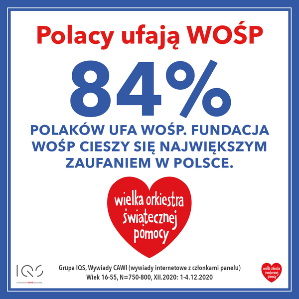 84% Polaków ufa Fundacji Wielka Orkiestra Świątecznej Pomocy – to wynik badań przeprowadzonych w grudniu 2020 roku przez Grupę IQS. Pod względem zaufania Orkiestra zajęła pierwszą lokatę pośród kilkudziesięciu instytucji i organizacji ujętych w zestawieniu. Fundacja WOŚP już od 20 lat cieszy się największym zaufaniem społecznym spośród wszystkich organizacji życia publicznego w Polsce.