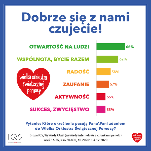 Badanie przygotowane przez Grupę IQS jest również źródłem informacji nt. wizerunku emocjonalnego Wielkiej Orkiestry Świątecznej Pomocy i sympatii w stosunku do organizacji. Zdaniem większości respondentów WOŚP to otwartość na ludzi (66%), wspólnota i bycie razem (62%), a także radość (58%), zaufanie (57%) i aktywność (55%). Aż 86% ankietowanych przyznało, że darzy Fundację sympatią.