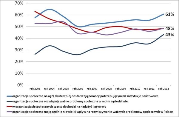 Jednocześnie wciąż prawie połowa Polaków wątpi w uczciwość trzeciego sektora i od siedmiu lat wskaźnik ten oscyluje w okolicach 50%. Warto jednak zaznaczyć, że obraz organizacji społecznych znacząco się poprawił w stosunku do lat 2003-2005. W 2012 r. 48% respondentów zgadzało się ze stwierdzeniem, że „w organizacjach często dochodzi do nadużyć i prywaty”, podczas gdy dziewięć lat wcześniej opinię tę podzielało aż 63% badanych.