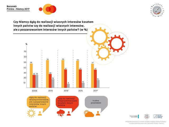 Tegoroczne wydanie badań z cyklu Barometr Polska-Niemcy pokazuje także, że polskie społeczeństwo nie jest również jednomyślne w ocenie, czy Niemcy widzą w Polsce partnera. Nadal więcej Polaków uważa, że Niemcy rzadko lub w ogóle nie traktują Polski po partnersku (47%), niż sądzi, że Niemcy czynią tak zawsze lub często (39%). Przy czym i w tym ostatnim przypadku odsetek pozytywnych opinii zmalał.