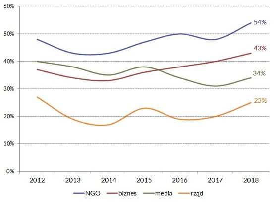 Jak wynika z najnowszych badań przeprowadzonych na potrzebę Edelman Trust Barometer, organizacje pozarządowe cieszą się wyższym zaufaniem niż trzy inne sektory (rząd, biznes i media). Badanie w 28 krajach świata dotyczyło zaufania do różnego rodzaju instytucji – administracji rządowej, biznesu, mediów i organizacji pozarządowych.