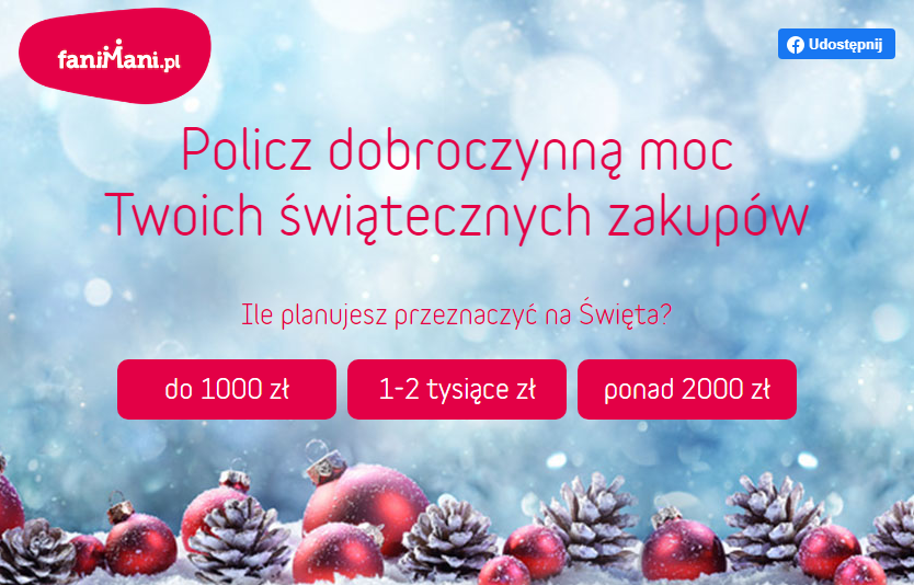 Osoby korzystające z serwisu FaniMani.pl pomagają przy okazji zwykłych, codziennych zakupów online. Okres przedświąteczny to zawsze czas jeszcze bardziej intensywnych zakupów i przygotowań. Wielu z nas robi robi je nie tylko dla siebie, ale też z myślą o najbliższych.