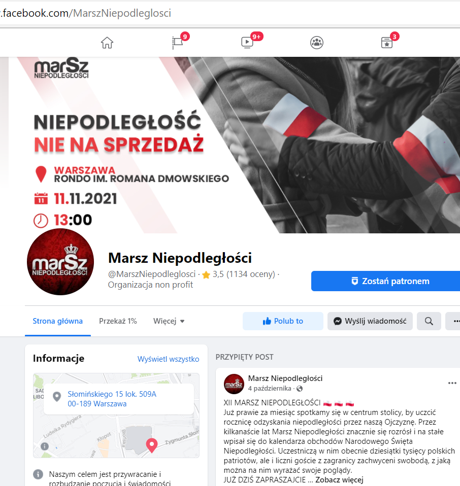 Even with this year’s march banned by the courts, Facebook is maintaining the page promoting a potentially violent event already deemed illegal by the Polish courts. The page has more than 257,000 followers. Among many other posts, their pinned post advertises and fund raises for the event, calling for supporters to ‘HELP US organize the biggest patriotic manifestation in Europe.’