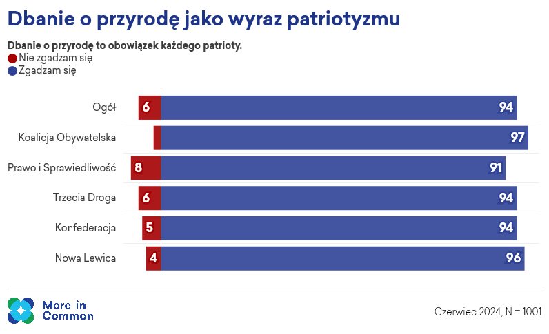 Wyniki badań jednoznacznie wskazują, że troska o środowisko może łączyć polskie społeczeństwo ponad podziałami, a troska o dobrostan naszej planety i polskiej przyrody są ponadpartyjne i wymykają się społecznej polaryzacji. Niemal wszyscy badani zgadzają się, że dbanie o przyrodę jest naszym patriotycznym obowiązkiem.