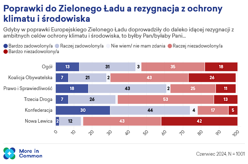 Jak pokazują badania, ponad połowa respondentów oczekuje w nowej kadencji Parlamentu Europejskiego i Komisji Europejskiej zmian w Zielonym Ładzie. Jednak gdyby te poprawki doprowadziły do rezygnacji z ambitnych celów ochrony klimatu i środowiska, ponad połowa naszego społeczeństwa byłaby z tego niezadowolona. Odsetek niezadowolonych wśród wyborców Koalicji Obywatelskiej wyniósłby aż 70%, a Lewicy nawet 85%.