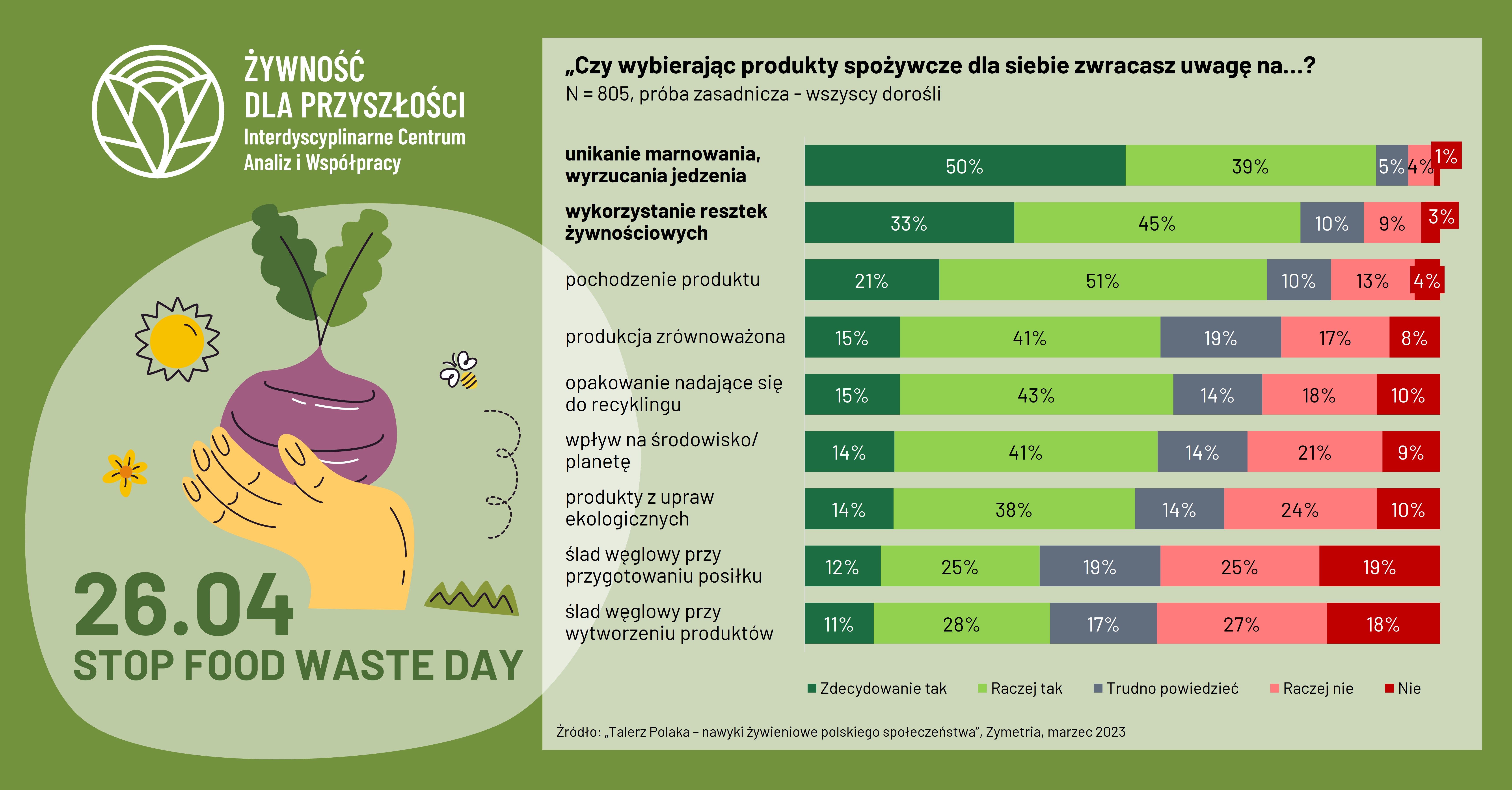 50% Polaków, wybierając produkty spożywcze, zwraca uwagę na unikanie marnowania i wyrzucania jedzenia, ale tylko 33% deklaruje wykorzystanie resztek żywnościowych – wynika z raportu „Talerz przyszłości”, opracowanego przez Interdyscyplinarne Centrum Analiz i Współpracy Żywność dla Przyszłości. W obliczu obchodzonego 26 kwietnia STOP FOOD WASTE DAY, który skupia się na walce z marnowaniem żywności, statystyki te nabierają podwójnego znaczenia.