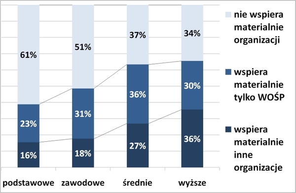 Wspieranie organizacji społecznych jest wyraźnie związane z wykształceniem: dary pieniężne lub rzeczowe przekazało dwie trzecie Polaków, którzy ukończyli studia wyższe i 39% z wykształceniem podstawowym. Jeszcze większe róznice widać, jeśli chodzi o wspieranie organizacji innych niż WOŚP: w tym zakresie aktywność przejawia 36% osób z wyższym wykstzałceniem i zaledwie 16%-18% z wykształceniem podstawowym i zawodowym.