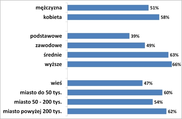 Widoczne jest też nieco częstsze wsparcie organizacji ze strony kobiet (58%) niż mężczyzn (51%).