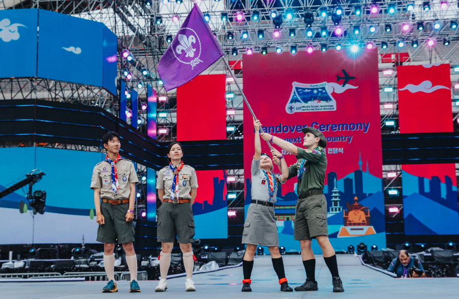Grupa skautów z Korei Południowej oraz z Polski na scenie podczas uroczystości – dwoje uczestników z Polski podnosi fioletową flagę z logo Światowej Organizacji Skautowej, a obok stoją inni w mundurach. W tle widać dużą, oświetloną scenę z ekranami i napisem dotyczącym ceremonii przekazania Jamboree.