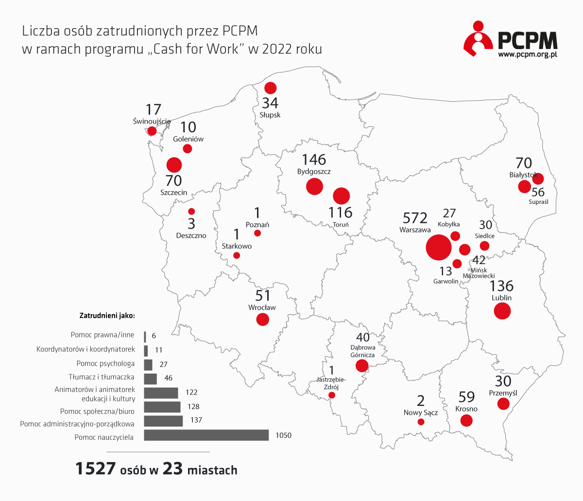 Zatrudnione osoby stały się częścią społeczności szkolnej, a ich pomoc i wsparcie jest nieocenione. Łącznie Fundacja PCPM zatrudniła w różnych zawodach 1527 osób w 23 miastach (patrz infografika).