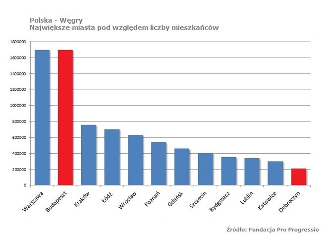 Na Węgrzech miast powyżej 100 tys. mieszkańców jest dziewięć, ale tylko ich stolica, Budapeszt (1,7 mln mieszkańców), może być zestawiana z dziesięcioma największymi miastami w Polsce. Drugie co do wielkości miasto na Węgrzech, to już zaledwie 211 tys. mieszkańców i plasuje się poniżej czternastego miasta w Polsce (poziom Sosnowca).