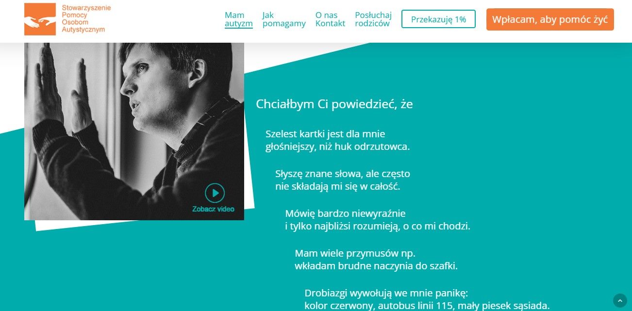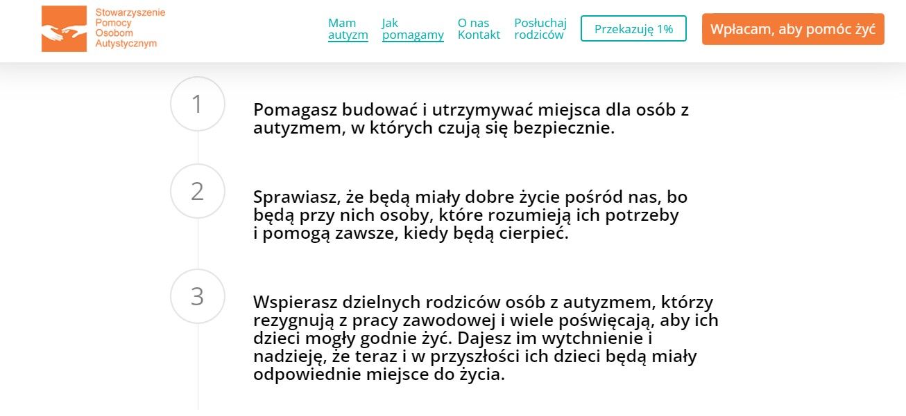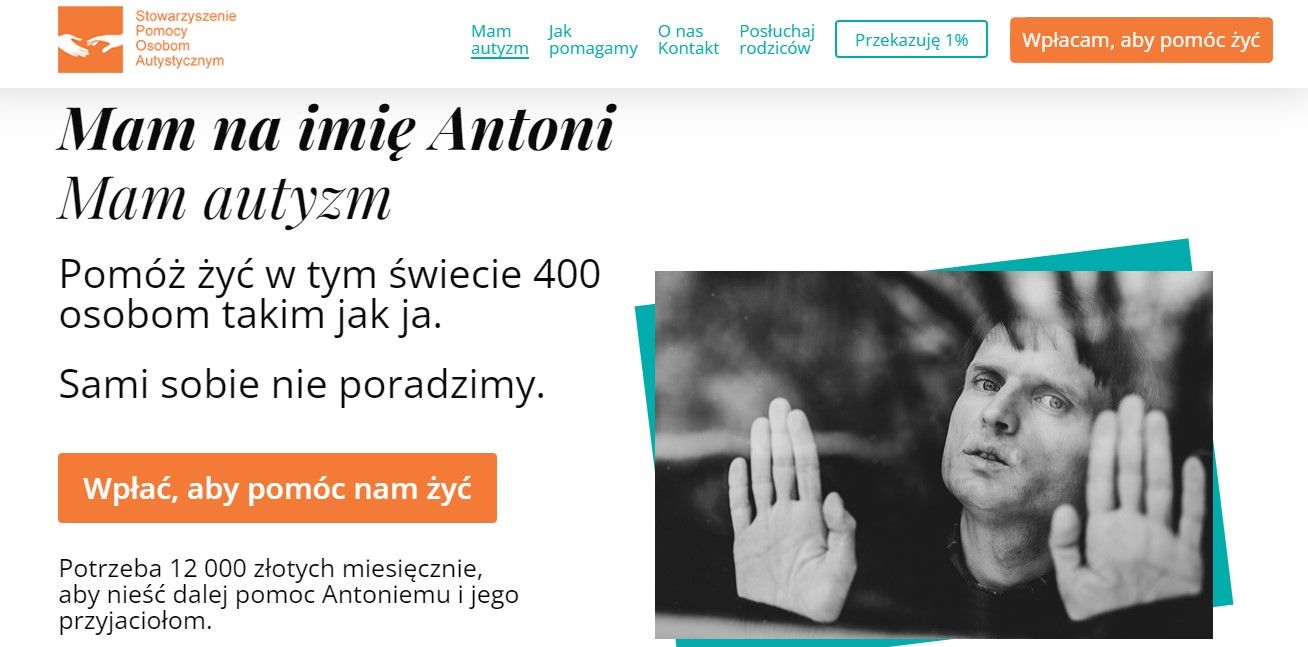 Oto przykład strony kampanii edukacyjno-fundraisingowej MAM AUTYZM. Stowarzyszenie Pomocy Osobom Autystycznym (SPOA) pokazuje darczyńcom, ile środków im średnio brakuje miesięcznie. Kampania ma również wymiar edukacyjny, bo treści nie tylko podkreślają wezwanie do finansowego zaangażowania się, ale również na stronie i w materiałach promocyjnych jest przybliżona codzienność osoby, która ma autyzm.