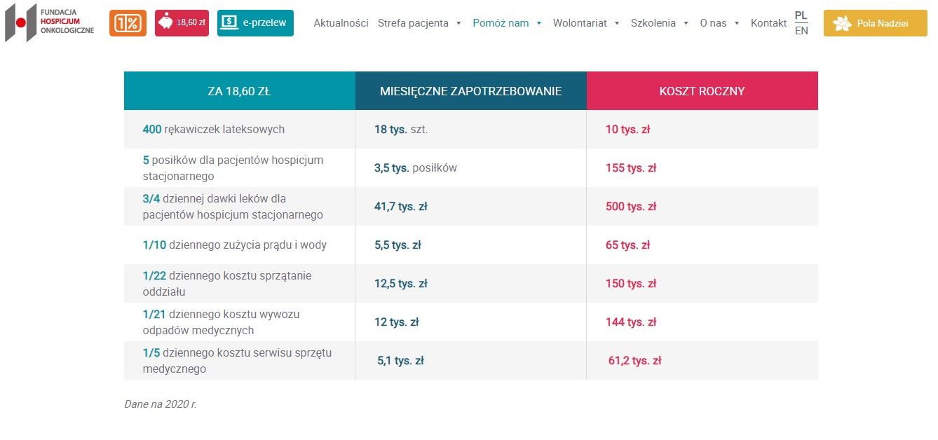 Jak widać na stronie www Fundacji Hospicjum Onkologiczne podanie przykładów kosztów dobitnie obrazuje, jak wielkim wyzwaniem jest prowadzenie tego typu placówki.