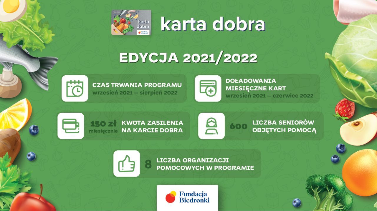Fundacja Biedronki uruchomiła nowy program skierowany do lokalnych organizacji pomocowych. W jego ramach przekazuje im karty na zakupy do sklepów Biedronka, a te następnie trafiają do potrzebujących seniorów. Program wystartował we wrześniu 2021 r. – objął osiem lokalnych fundacji i stowarzyszeń. Karty dobra Fundacji Biedronki trafiły do ponad 600 potrzebujących seniorów i przez rok będą stanowiły realne wsparcie ich domowych budżetów.