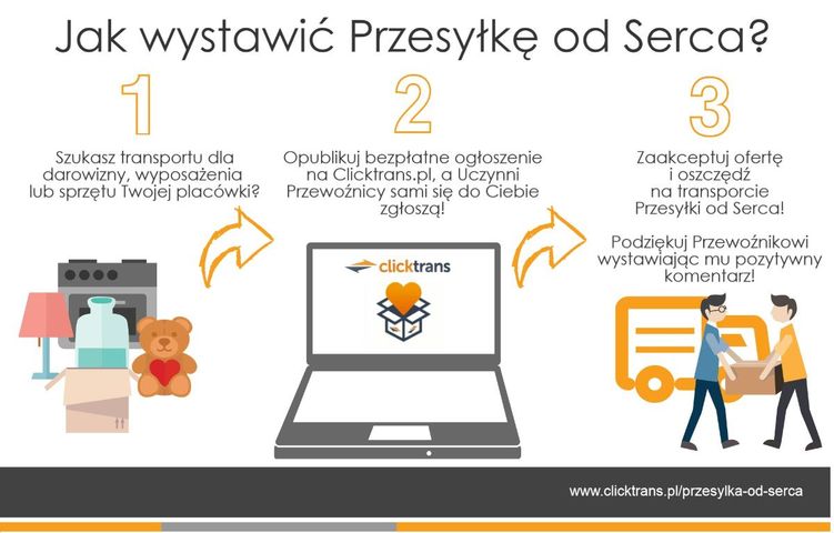 Przesyłki od Serca to program, który powstał z myślą o tych, którzy pomagają. Organizacje pozarządowe, które otrzymują darowizny od firm lub prywatnych darczyńców często zmagają się z problemem kosztownego transportu podarunku. Właśnie dlatego Clicktrans.pl stworzył platformę Przesyłek od Serca – strefę, która pozwoli organizacjom oszczędzić na transporcie przesyłek. Od tej pory otrzymywanie materialnych darowizn na obszarze Polski i Europy będzie znacznie łatwiejsze. Wystarczy wystawić bezpłatne ogłoszenie o Przesyłce od Serca i wybrać Uczynnego Przewoźnika, który bezpiecznie przewiezie darowizny we wszelkiej formie – od paczek niewielkich rozmiarów, przez meble, sprzęt RTV i AGD aż po przedmioty o dużych, nietypowych rozmiarach.