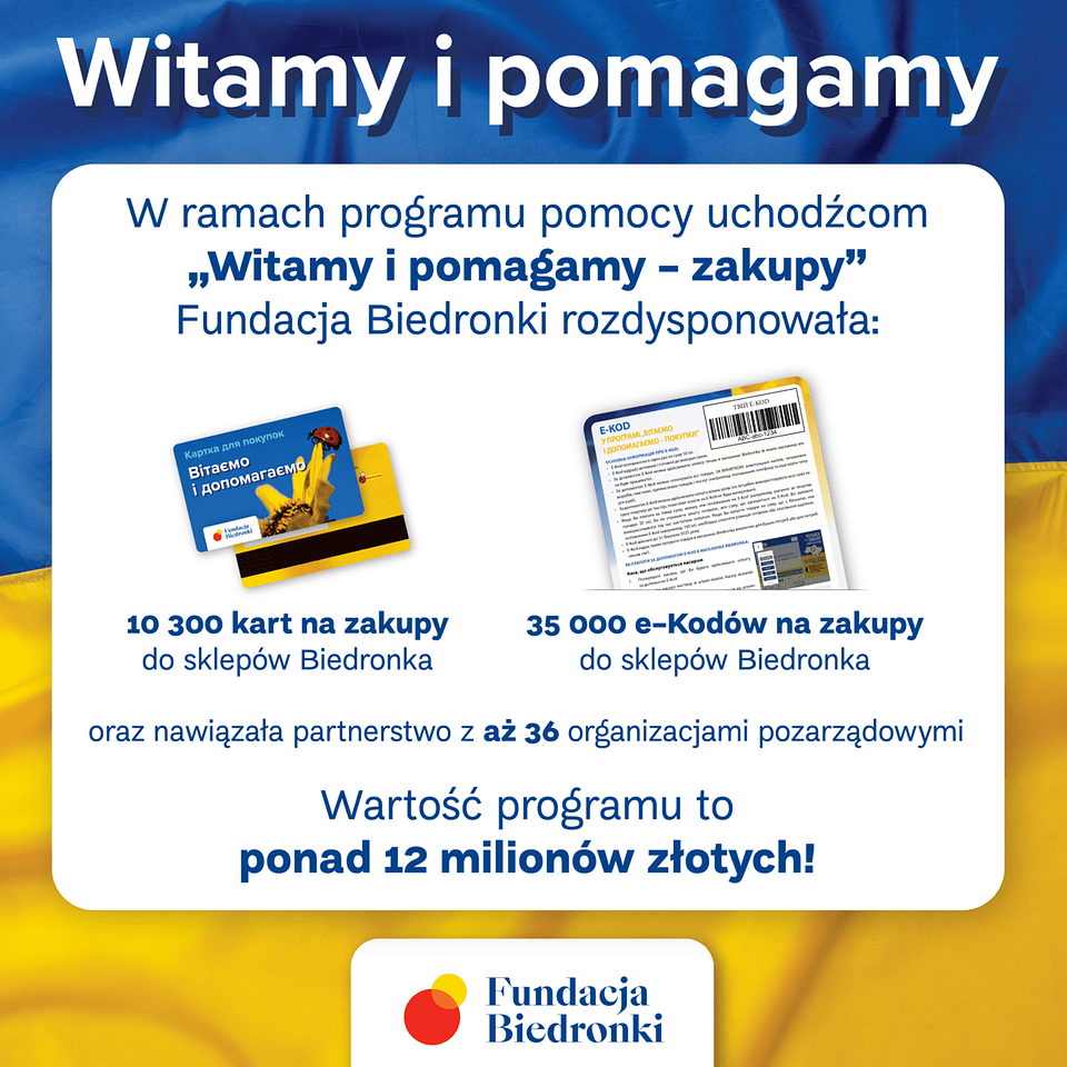 W ramach programu „Witamy i pomagamy – zakupy” Fundacja Biedronki rozdysponowała ponad 10 000 kart na zakupy dla uchodźców. Karty są przeznaczone dla najbardziej potrzebujących osób, które przyjechały do Polski w związku z wojną w Ukrainie. Będą zasilane kwotą 300 zł przez 3 miesiące.