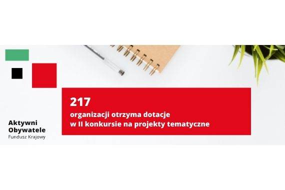 217 organizacji społecznych działających na rzecz: ochrony praw człowieka i obywatela, pomocy grupom i osobom narażonym na wykluczenie społeczne, włączania obywateli i obywatelek w życie publiczne i aktywność społeczną otrzymało dotacje w wysokości 10,6 mln euro w II konkursie dotacyjnym programu Aktywni Obywatele – Fundusz Krajowy, finansowanym ze środków Europejskiego Obszaru Gospodarczego (tzw. Funduszy EOG).