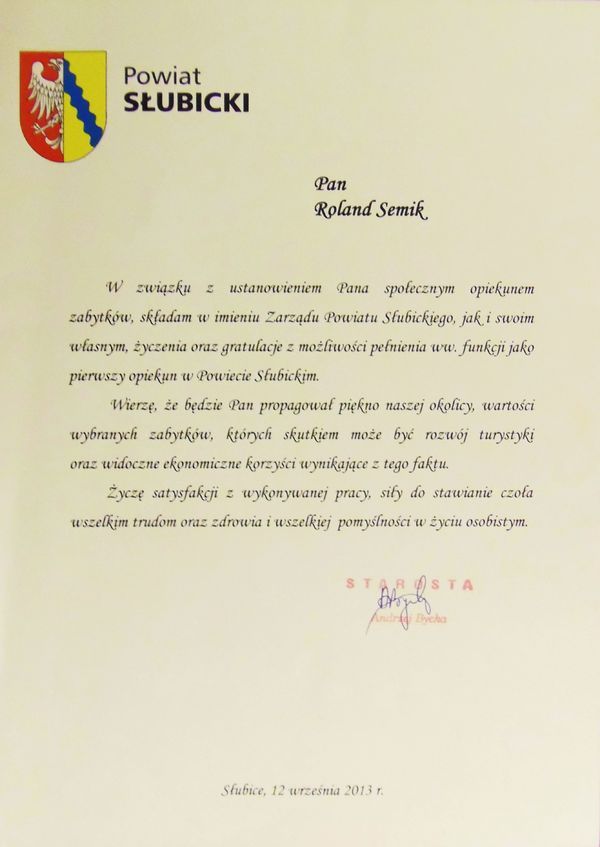 Decyzją z 5 sierpnia 2013 r. starosta słubicki Andrzej Bycka na wniosek Lubuskiego Wojewódzkiego Konserwatora Zabytków ustanowił Rolanda Semika społecznym opiekunem zabytków, pierwszym na terenie powiatu słubickiego. Uroczyste wręczenie legitymacji odbyło się 12 września podczas zebrania Zarządu powiatu słubickiego.