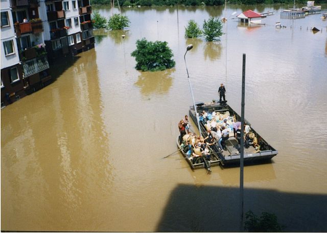 Ubrany w zieloną koszulkę mężczyzna, niesie na plecach starszego mężczyznę, na którego twarzy malują się zmęczenie i strach, w tle łódź, blokowiska, inni brodzący w wodzie ludzie – to jedno ze zdjęć Krzysztofa Millera, fotografa „Gazety Wyborczej”, zrobione 12 lipca 1997 roku podczas ewakuacji mieszkańców osiedla Zaodrze w Opolu.