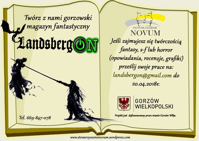 Stowarzyszenie NOVUM dzięki dotacji z Urzędu Miasta Gorzowa Wlkp. przygotowuje pierwszy gorzowski półrocznik fantasy - "LandsbergON". Wszyscy chętni do opublikowania swojej twórczości mogą zgłaszać się do redakcji do 20 kwietnia 2018 r.