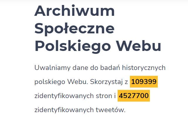 Ponad 100 tys. skategoryzowanych adresów URL i 4 mln identyfikatorów tweetów można wykorzystać bezpłatnie do celów badawczych dzięki działaniom Archiwum Społecznego Polskiego Webu (ASPW, https://aspw.pl/). Od listopada 2020 archiwum indeksuje strony internetowe linkowane we wpisach polskich użytkowników Twittera i udostępnia informacje na temat ich obecności w archiwach Webu. Zbiory archiwum dostępne są na wolnej licencji Open Data Commons Attribution License (ODC-By) i mogą być z powodzeniem wykorzystane jako otwarte dane badawcze.