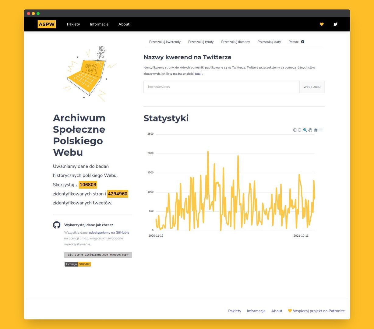 – Zależy mi na tym, żeby ułatwić inicjowanie badań z wykorzystaniem zasobów WWW – mówi Marcin Wilkowski, założyciel ASPW. – Pierwszym problemem, na jaki natrafia osoba chcąca przygotować analizy internetowe, jest dostępność danych historycznych. ASPW publikuje je za darmo i na wolnej licencji. Ponieważ gromadzone adresy stron pochodzą z korpusu twitterowego, możemy oczekiwać, że lepiej reprezentują najważniejsze społecznie zasoby polskiego Webu niż adresy gromadzone losowo. Wykorzystanie mediów społecznościowych w budowie zasobu archiwalnego to zresztą podejście od kilku lat mocno obecne w literaturze naukowej dotyczącej archiwistyki Webu.